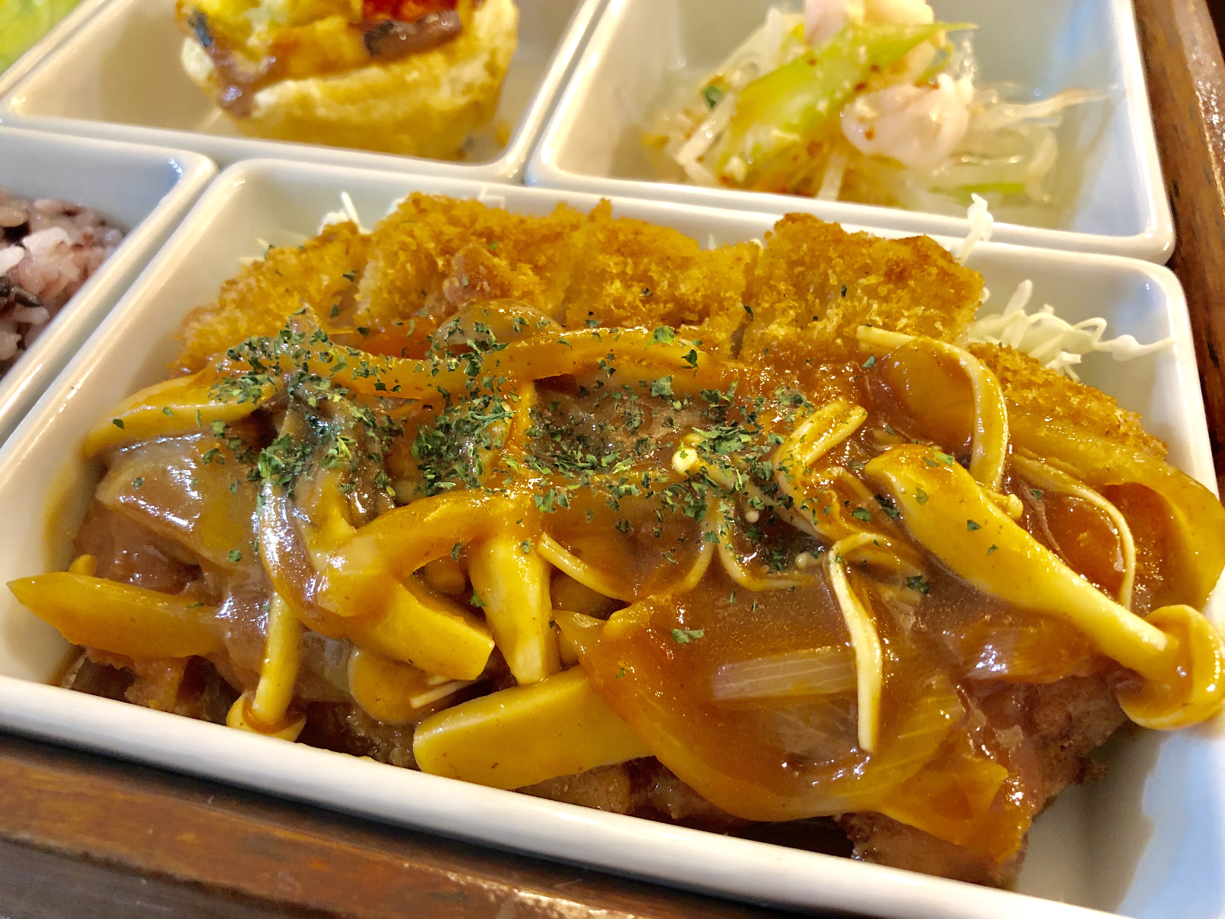 『ミルフィーユカツ〜きのこのデミグラスソース』です。 付け合わせの一品は 『枝豆とサーモンのクリームパスタキッシュ』と 『タイ風春雨和え』 ...